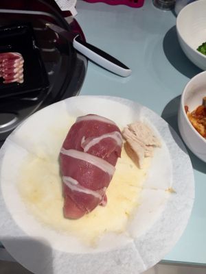 放少许油下锅煎,先煎培根尾部容易开口的位置,每一面都要煎,尤其是肥肉,让肉吸收油脂,味道更香