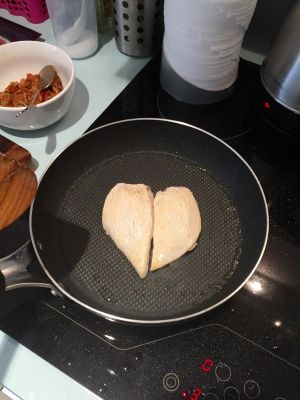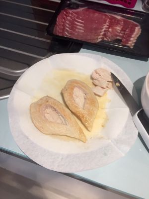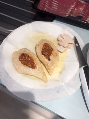鸡胸完成了,就把最中间的肉剔开,用于放馅料,可以不放,随个人爱好,中间有内容不会那么单一