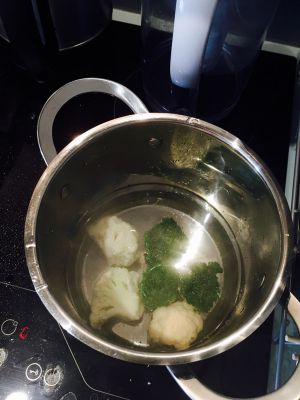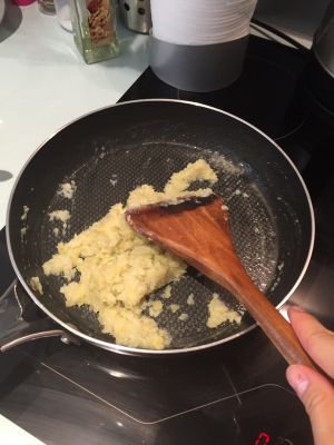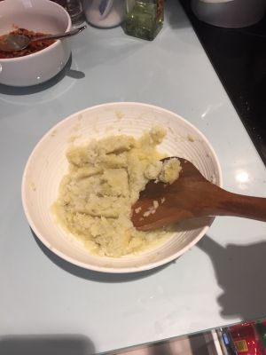 将椰菜花和番薯压成泥,有搅拌机可以用机器搅碎,口感更滑