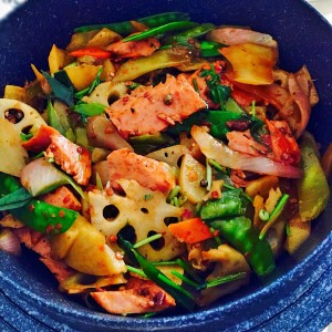 起油爆香干辣椒、洋葱和青蒜,加香锅底料翻炒,放入午餐肉和调汁(生抽+老醋+花椒油+蚝油+五香粉)翻炒,陆续放入过油的土豆、胡萝卜,过水的莴笋、莲藕、荷兰豆,翻炒均匀关火加香菜完成。注:干辣椒和花椒油可以不放。视个人情况而定。