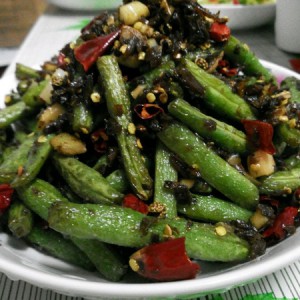 油没过锅底预热,用大火加入四季豆不停翻炒,炒至四季豆表面略带黄色,干煸状态。转入小火,加姜蒜末(不要太细,粗点更好),等到有蒜香即可加入干辣椒花椒,再放入盐,味精,就可装盘。