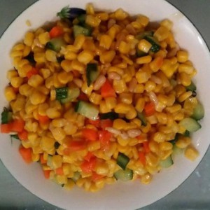 锅内加油,将玉米倒入,翻炒20s后加入焯熟的胡萝卜继续翻炒,加入黄瓜,三勺白糖以及小半勺盐。继续翻炒保证汤汁基本均匀后,加入两勺水淀粉大火收汁既可出锅。