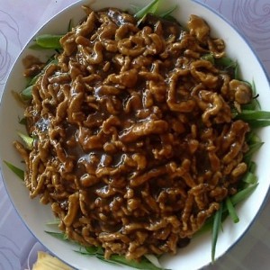 面酱入锅翻炒 加少许水 及调料后倒入肉丝 翻炒至每个肉丝均变色后 加少许淀粉勾芡后 盛入摆好的葱盘里即可