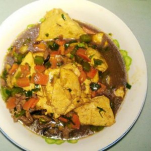 锅内剩适量油,放入蒜片爆炒,然后把青椒、红萝卜、香菇、猪肉倒入一起炒约2分钟。后放入青蒜和煎好的豆腐,加入适量水、酱油、盐及豆瓣酱,盖上锅盖煮约3分钟(视水量大小,煮久则豆腐会更入味)。