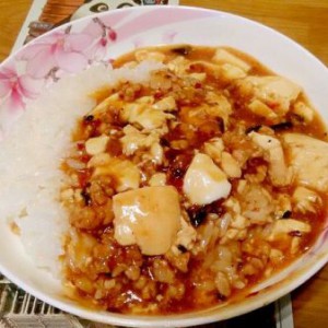 煮滚后,加入豆腐。大火煮滚后,小火焖3分钟。调好淀粉,入锅勾芡,大火煮滚,上盘盖饭。