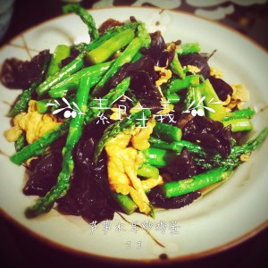热锅后油烧热放入鸡蛋,炒散捞出备用。余油倒入芦笋和木耳翻炒,倒入一汤勺生抽、一茶匙糖、一汤勺蚝油继续翻炒,炒至芦笋颜色略深放入炒好的鸡蛋,放一点盐、鸡精,起锅倒一茶匙醋提香即可。