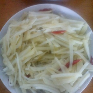 把青椒和土豆切成丝。如果土豆切的不够的可以用刨子把土豆刨成丝