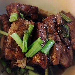 待水剩三分之一时,加入盐、鸡精调味,继续炖,剩三分之一的一半时,大火收汁。出锅装盘,撒上葱花。色泽红润软烂,开吃!