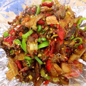 先炒香配料,火不要大,然后放入鸡块,加生抽、糖、少许盐,最后放入尖椒圈圈,炒几下,出锅!