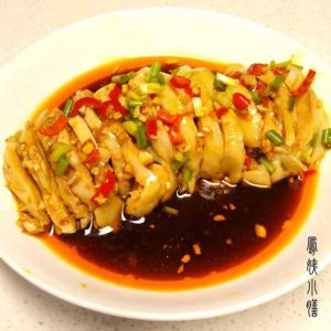 取碗调汁:生抽2勺、陈醋1勺、芝麻油1勺、白糖半勺、盐适量、蒸完后的鸡汤2勺、蒜末、姜末,再兑入合成的辣椒油,搅拌均匀(根据各人口味调整);