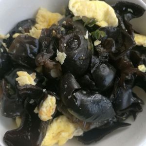 放木耳翻炒,翻炒木耳容易迸溅,请注意安全,一段时间后放入提前煎好的鸡蛋,再放盐继续翻炒,入味即可