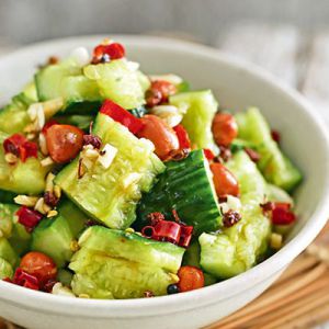 烧热的香油倒入盛有蒜的碗中,拌匀,依次再加入生抽、白砂糖、盐、香醋,将调味汁拌匀后淋在黄瓜上,翻拌均匀腌制15分钟左右。上桌前,将炸得香脆的花生米倒入黄瓜中拌匀即可。