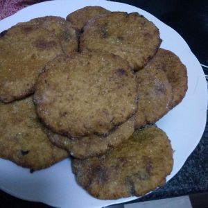 先将油烧热,将南瓜饼放入油锅不停的翻面,至两面金黄色。OK了。