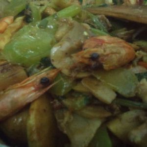 再把虾倒进去炒一会,再放入莲藕杏鲍菇冬笋炒,一会后放入莴笋西蓝花
