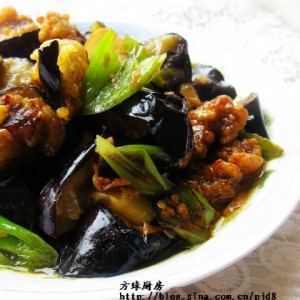 把炸好的肉段和茄子倒进锅里,然后把事先调好的味汁倒进去,翻炒收汁后出锅!