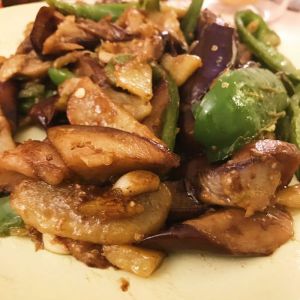 不用洗锅,锅里再放点油。先炒青椒翻炒,随后放蒜。翻炒一会,随后倒入茄子和土豆。