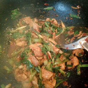 接着倒入蒜苗白跟青椒,