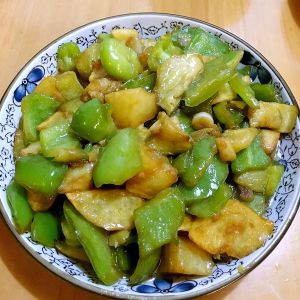 茄子、土豆削皮切成滚刀块,青椒洗净掰成小块。