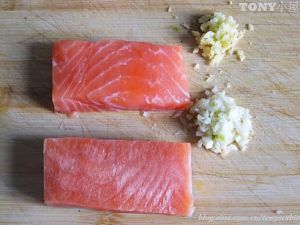 先把三文鱼切成三厘米厚左右的小块;把葱姜切成末。