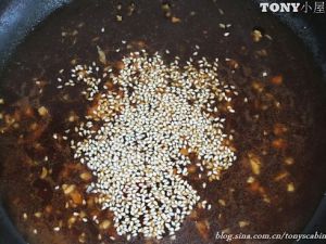 加入已经炒熟的白芝麻。把这个蜜汁浇在煎好的三文鱼上就大功告成了啊!