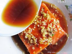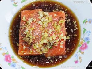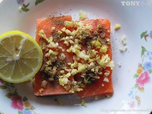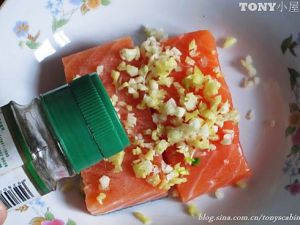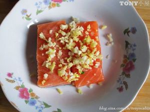 把三文鱼放入一个盘子,蒜末和姜末撒在上面。