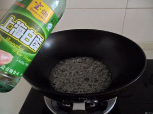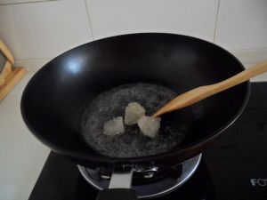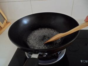 6.熬煮至冰糖或白糖全部融化,水分蒸发,锅里出现细小的白气泡,淋入1/2汤匙白醋。