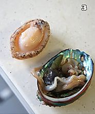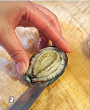 将刀伸入活鲍鱼的肉、壳之间,使肉壳分离