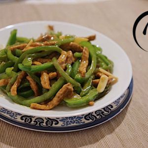 准备好食材,瘦肉切丝、青椒切丝,瘦肉冷冻一下更好切