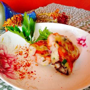 土豆压呀压,压成泥加入两大勺面粉,(土豆泥中加少量的盐)然后就是倒入所有的配料了调匀
