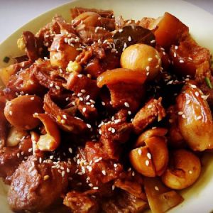 待冰糖化开,放肉,倒老抽10ml,使肉上色。