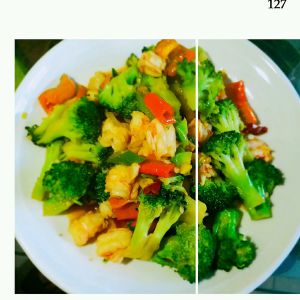 热锅凉油,加干辣椒,青椒,各种末炒香,放虾仁翻炒,点料酒,生抽,倒入焯水后的西蓝花翻炒后调味即可。