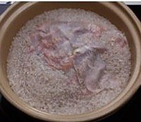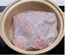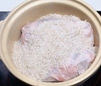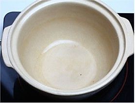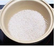 将炒热的海盐一半倒入砂锅内,小火烧砂锅传热。