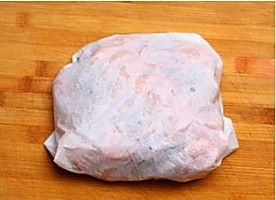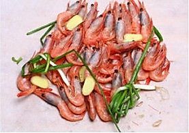 北极虾自然解冻,用油纸垫在北极虾下面,撒上姜片和小葱、撒上些许胡椒粉、绍酒、少许盐拌匀。