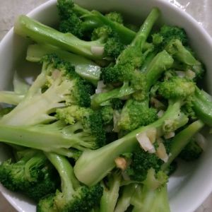 再锅内放入水,待水开之时,放入西蓝花,加入些许食盐。待沥出水后,锅内放油,下蒜爆香后加入西蓝花翻炒,放少许食盐、鸡精出锅