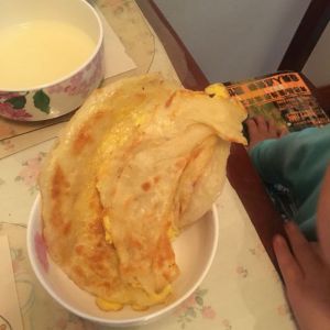 把擀薄的饼放入锅中,鸡蛋打散在饼上,划散,撒点盐,小火煎,待底面出现黄棕的点,(烙饼都有的那种斑点),此时鸡蛋略有凝固,翻面。继续煎。
