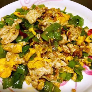 锅里烧滚放油,翻炒青椒,放少许盐,炒至辣椒皮皱缩盛起。