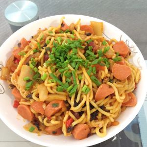 放入面,简单炒一炒,最后撒上葱花,大功告成。哦…还差刷碗才算真正的大功告成!