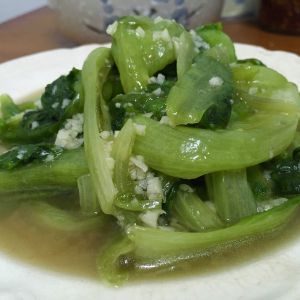 生菜炒至断生,放另一半蒜泥,微炒,放蚝油,再稍微炒一下,放盐,出锅~