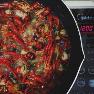 然后放入小龙虾炒至变色,加入生抽,老抽,糖,盐