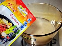 将大地鱼汤底料倒入锅中,一次性加足适量的清水,大火煮滚。