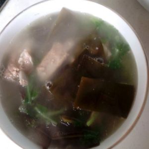 油,葱花炸锅,加水,放入排骨,煮沸放入海带