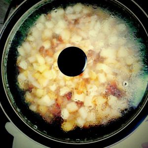 锅内放入少量油,中小火,加入两勺白糖,化开用铲子顺时针搅动,略变色时下入肉块,炒匀,倒入酱油,翻炒把肥肉的油炒出来,闻到肉香时放些盐,炒匀。加入土豆萝卜块,翻炒两下,倒入水,没过土豆六七分的样子。转大火烧开再转小火慢慢炖。