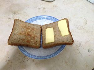 切上两片厚厚的黄油放在烤好的吐司上