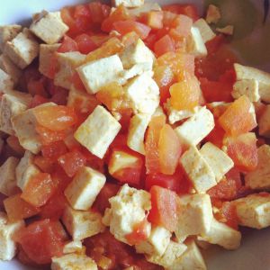 番茄下锅翻炒一分钟加入豆腐丁。不要过分翻炒、以免豆腐拌碎。起锅前可按自己口味,加一点点糖,去酸。