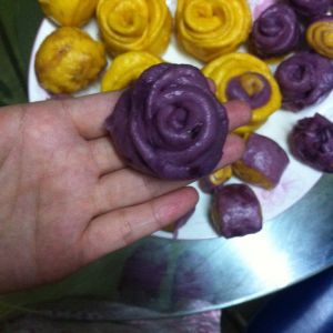 把紫薯和南瓜蒸软,南瓜里放面粉,千万不用放水哦,因为南瓜水分很多的,紫薯加面粉可以酌情加水的哦。揉面粉的时候里面要加点发酵粉,我是在店里买的那种一包的,可以用几次的。好了后,我放了三个小时,让它发到原来的二倍大。