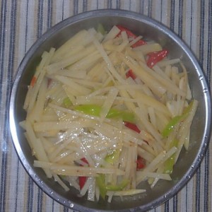 放入土豆丝,青红辣椒丝翻炒后出锅