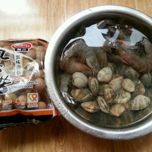 花蛤飞水去沙。虾剪去剑,须,足煮熟。蟹味菇去跟洗净