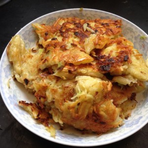 土豆打成丝,打入两个鸡蛋,一棵大葱或两棵香葱,加很少面粉,放入两小勺盐、味精,搅拌均匀