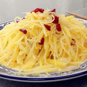 锅内上水烧开,放入土豆丝儿焯水三十秒,下入少许白醋,这样助于土豆丝的脆爽然后沥干水冲冰凉水。。。