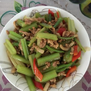 在锅中倒入油少许,等油烧滚,倒入肉丝,翻炒至变色,加少许生抽,翻炒均匀,倒入芹菜,加入少许盐。翻炒即可。